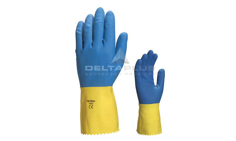VE330BJ天然双色乳胶浸胶手套,棉衬里,粗糙表面,易于紧握。耐磨性能佳。